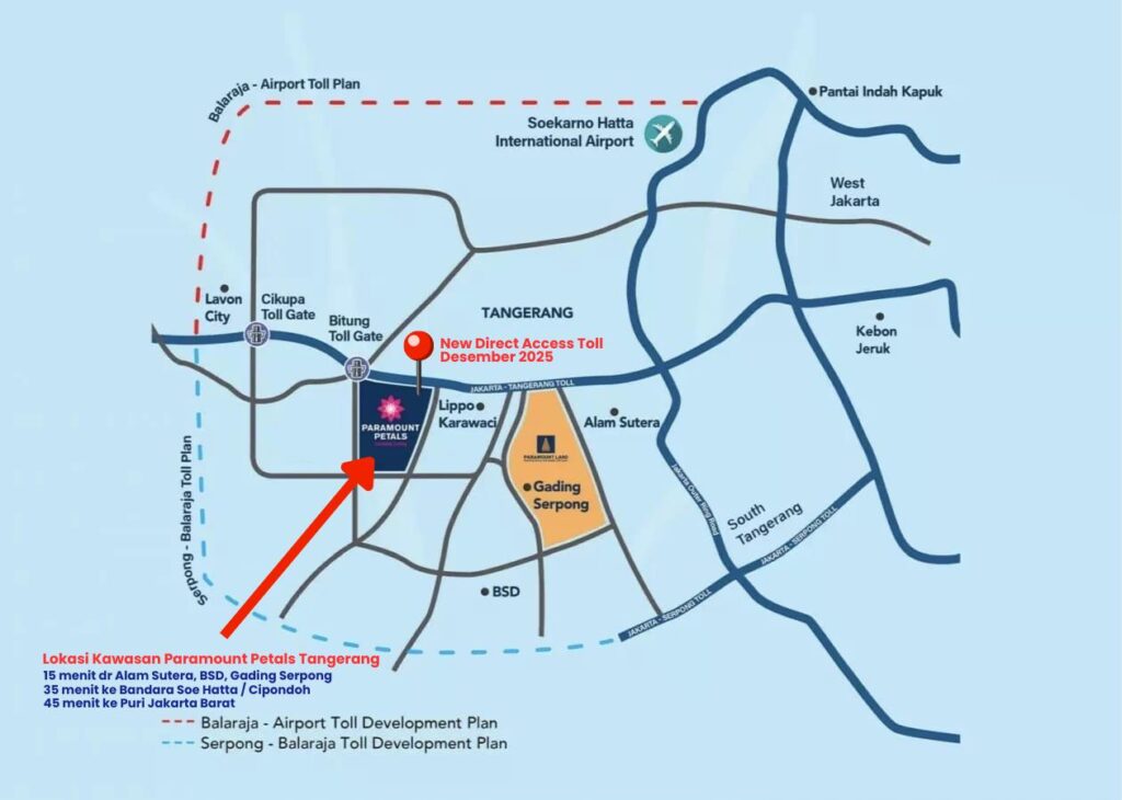Tinggal di Paramount Petals berarti lebih cepat sampai mana saja. Rencana jalan tol yang terkoneksi langsung ke kawasan ini akan siap digunakan di akhir 2025. Kamu & keluarga bisa menikmati perjalanan lebih efisien ke Jakarta Pusat, Bandara Soetta, BSD, dan sekitarnya